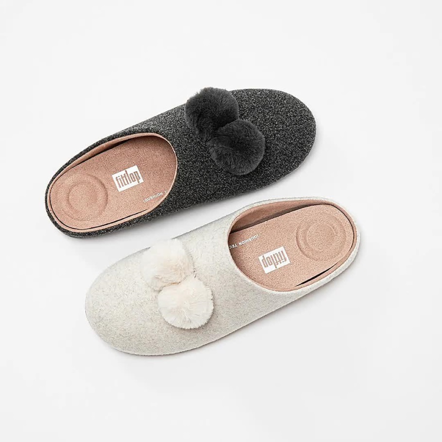 Modern, Minimal, Hauptsächlich Leicht Und Bequem – Diese Süchtig Machenden Kleinen Hausschuhe Wurden Zum Stilvollen Faulenzen Gemacht. Hier Aus Kuscheligem Filz Mit Flauschigen Bommeln Aus Kunstpelz, Diese Version Verfügt über Ein Einteiliges, Weich Gepolstertes, Fußumarmendes Obermaterial, Ein Weiches Mikrofaserfutter Und Unser Ultra-glattes, Federleichtes, Ergonomisch Geformtes Iqushion? Zwischensohlen. Mit Gummilaufsohlen, Damit Sie Nach Draußen Gehen Können (obwohl Sie Mit Diesen Pom-Pom-Hausschuhen Vielleicht Nie Das Haus Verlassen Möchten).