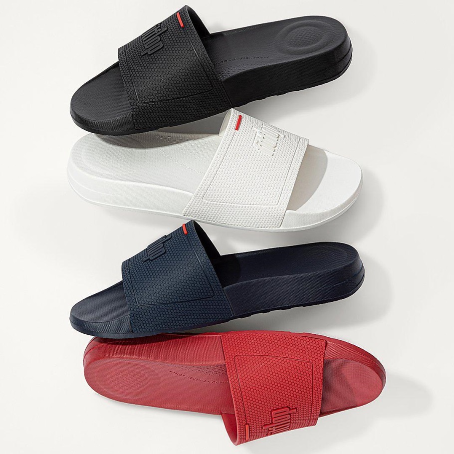 Die Pool-Slide-Cousins unserer Meistverkauften Surfer-Girl-Flip-Flops Sind Sportlich-lässig, Superleicht Und Gleichermaßen Wasserdicht. Darunter Ist Das Gleiche Iqushion? Mittelsohlen-Technologie: Ergonomisch Geformte Luftschaumpolsterung Mit Aufprallkissen Vorne Und Hinten Für Ganztägigen Gehkomfort. Oben Breite, Strandfreundliche Gummiriemen Mit Subtiler Textur, Einem Geprägten Logo Und Einem Fitflop-roten Etikett. Ein Paar Wird Ihre Warmwetter-Garderobe Sofort Auffrischen. Eintauchen!
