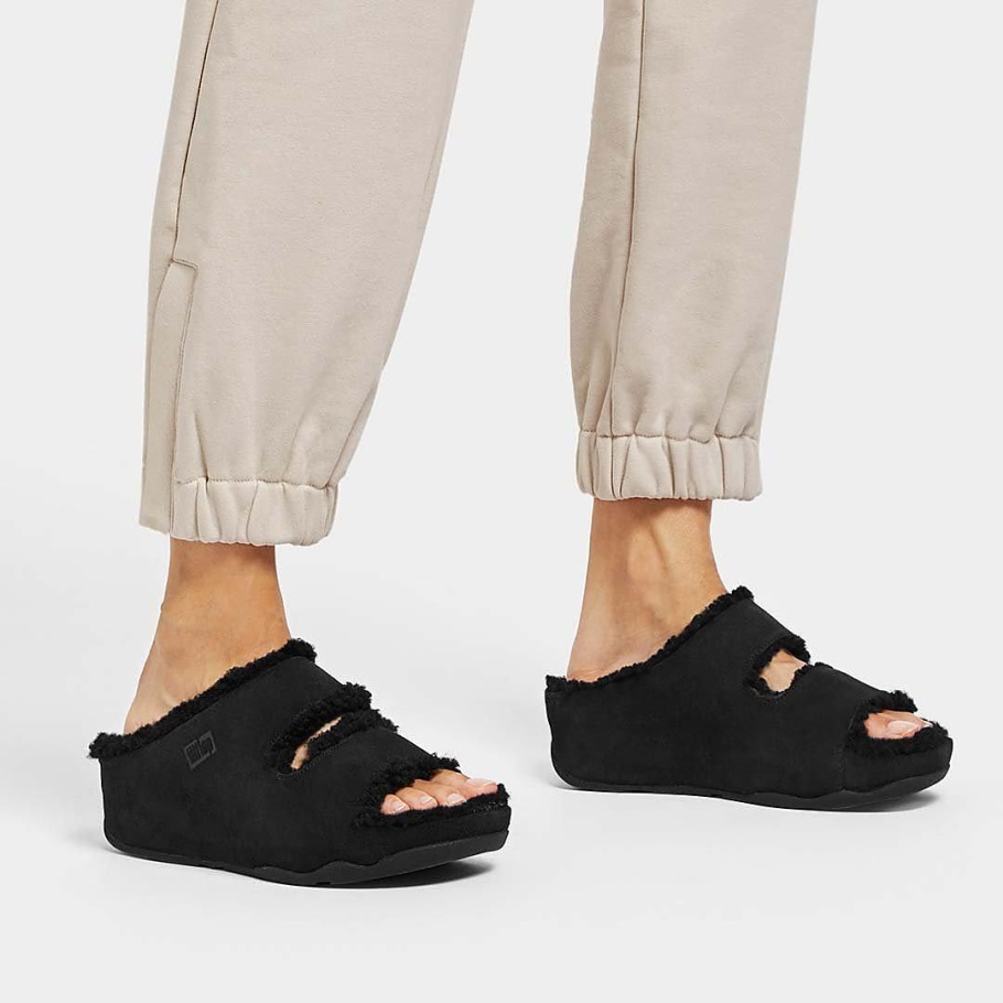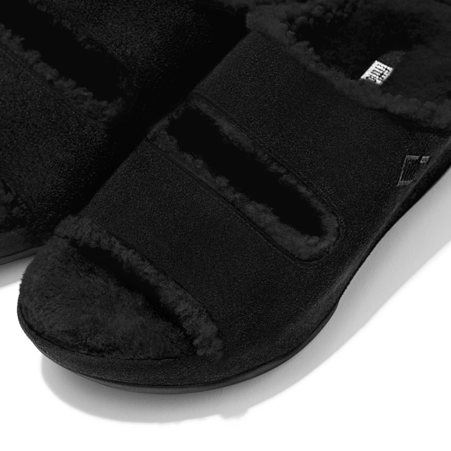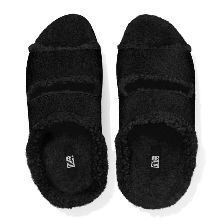 Fitflop Shuv Sandalen Aus Veloursleder Mit Lammfellfutter Und Zwei Riegeln, Ganz In Schwarz